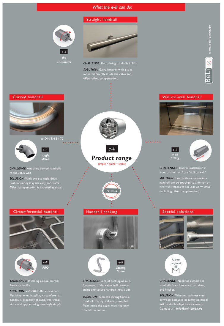 What e-li can do? e-li makes more out of your handrails for lifts. Challenges that are unsolvable with a standard handrail, such as thin walls, mirror fronts or special cabin shapes, can be solved with e-li easily. See for yourself how wide the range of solutions for handrails with e-li is.